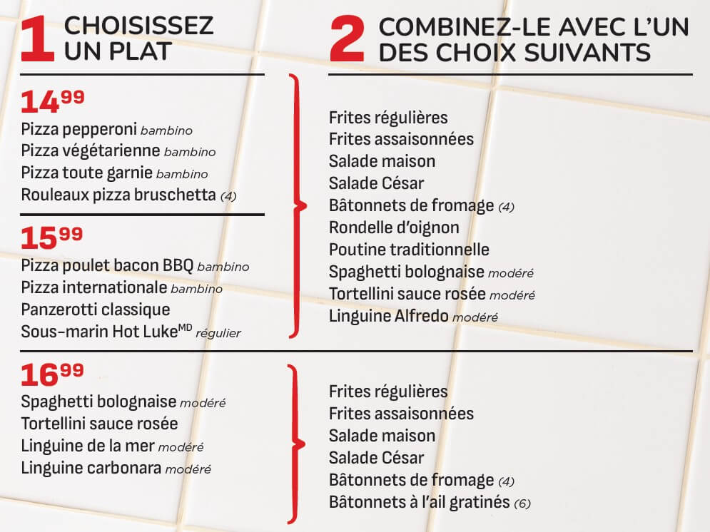 Peu importe l’option, tu obtiens un duo savoureux qui mélange le meilleur de notre menu : pizza bien garnie, pâtes réconfortantes ou sous-marins classiques. Une promotion idéale pour les dîners pressés, les soupers sans casse-tête ou les envies spontanées de comfort food.