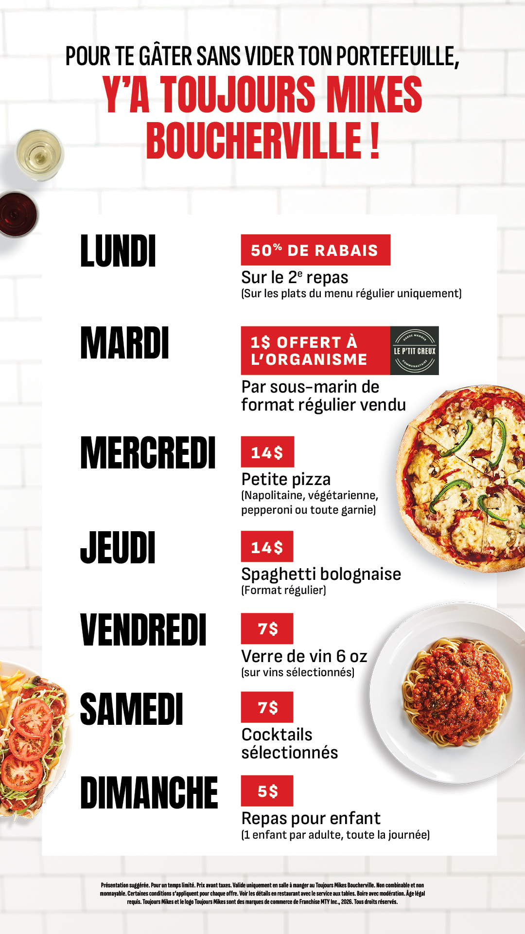 Découvre des rabais tous les jours en salle à manger au Toujours Mikes Boucherville!