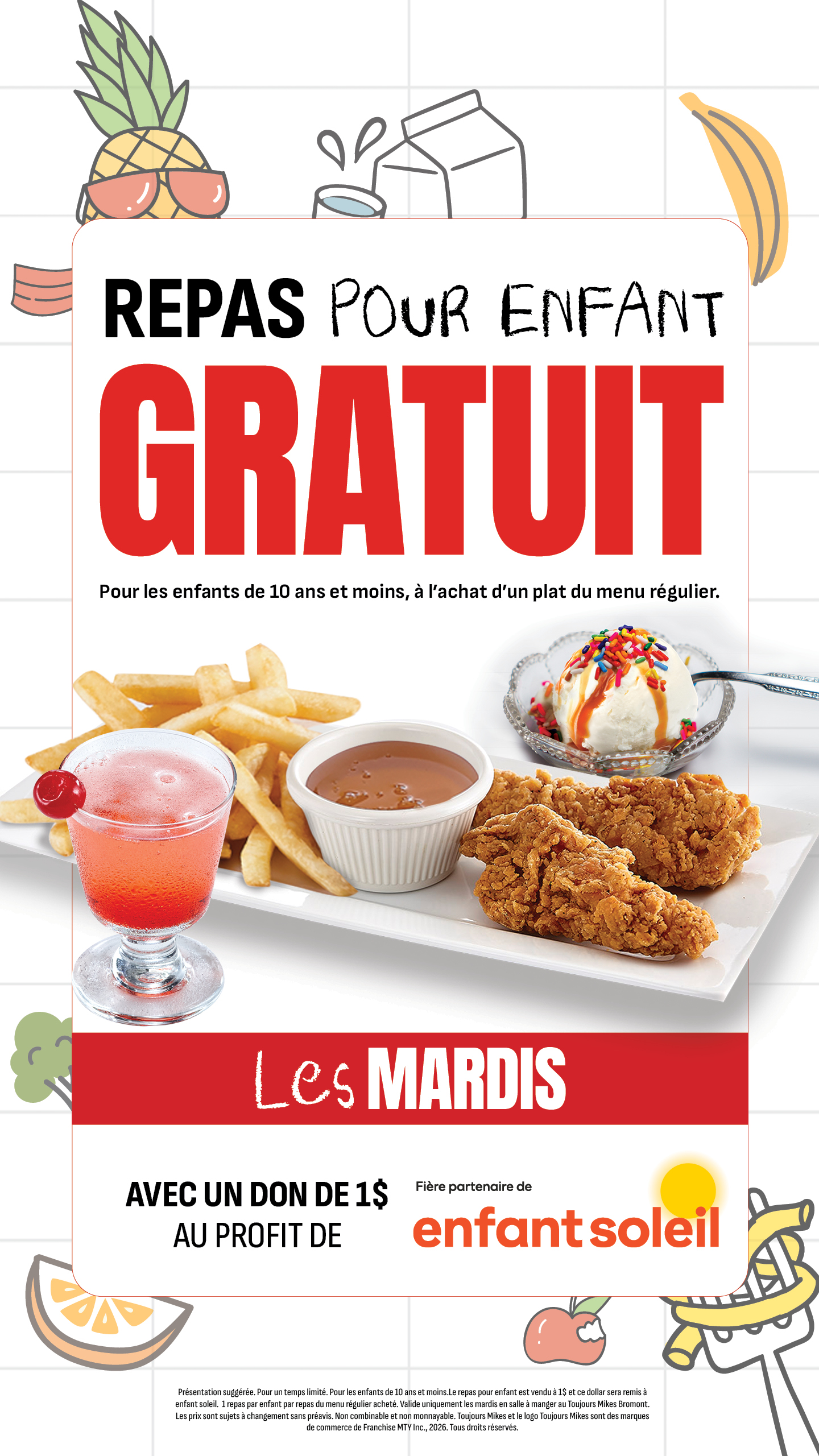 Les mardis, en salle à manger au Toujours Mikes Bromont, les enfants mangent GRATUITEMENT avec un don de 1$ à Enfant Soleil! Des conditions s'appliquent, voir les détails en restaurant.