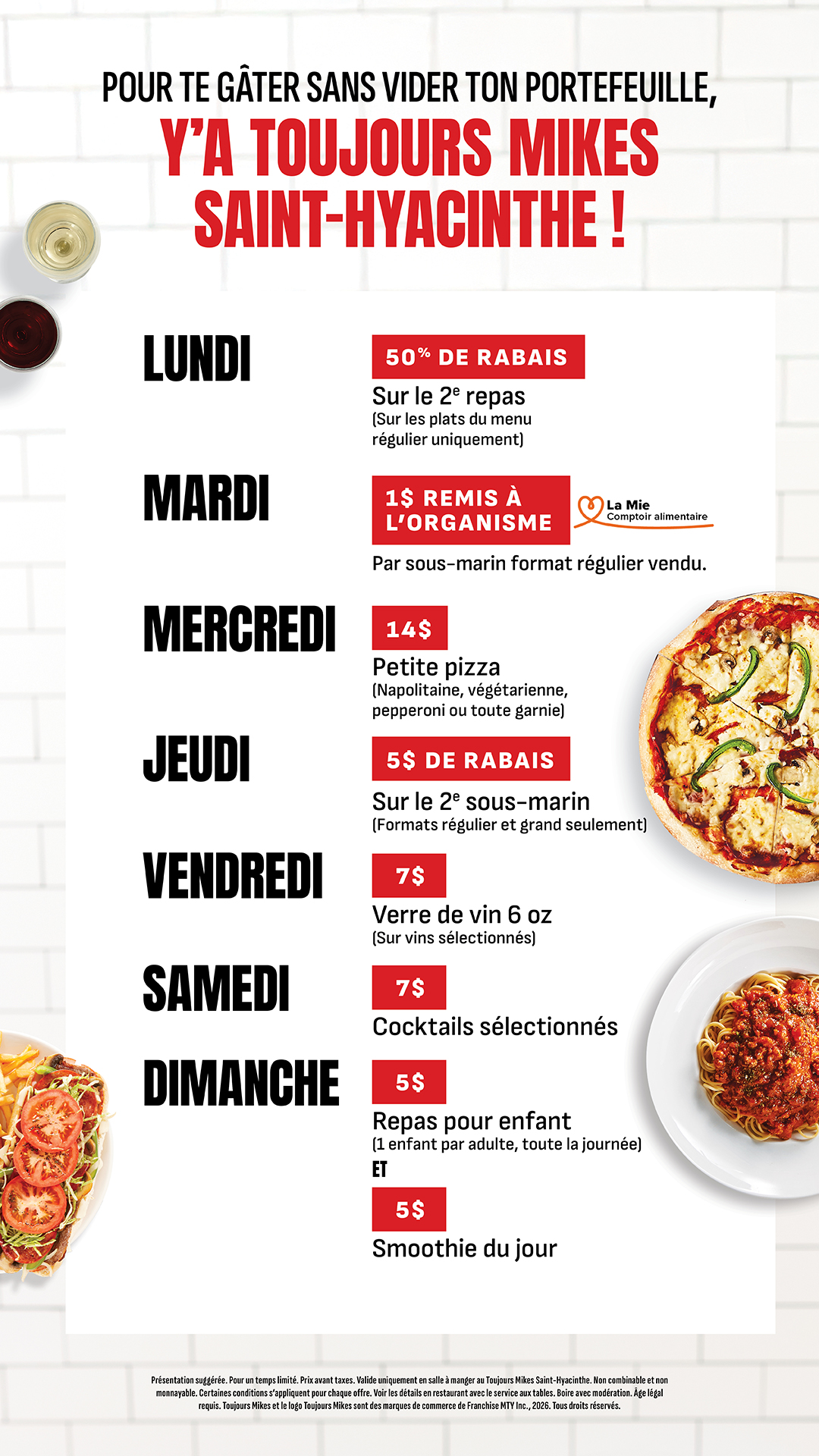 Découvre des rabais tous les jours en salle à manger au Toujours Mikes Saint-Hyacinthe!