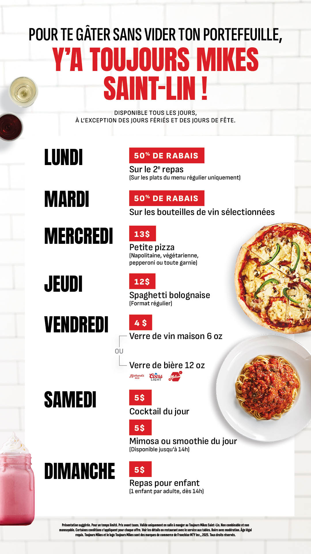 Découvre des rabais tous les jours en salle à manger au Toujours Mikes Saint-Lin!